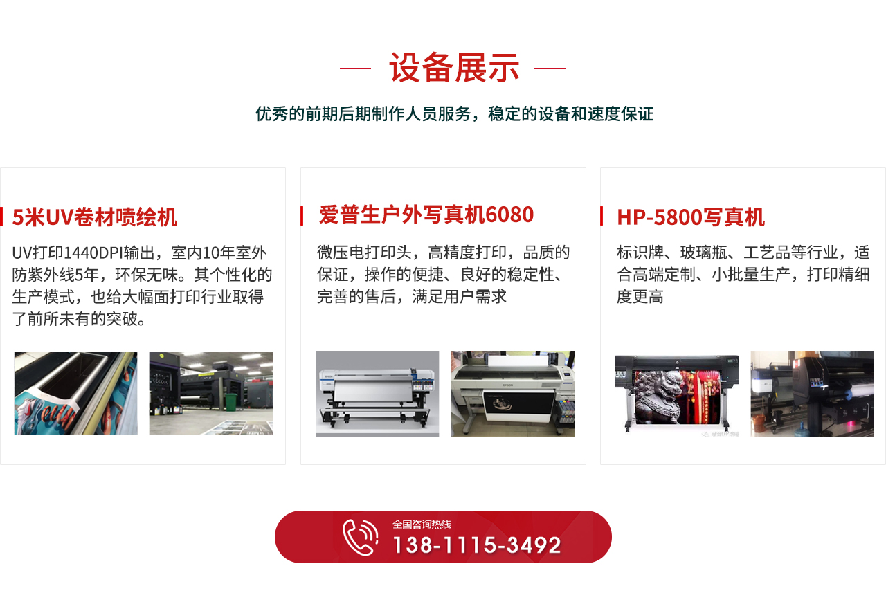 多臺5M3.2MUV打印設備,多臺愛普生HP打印設備,進口后道設備,全套多臺快速加工能力大廠房為批量加工奠定基礎能力的能力,快效的項目執行能力、優異的團隊協作能力